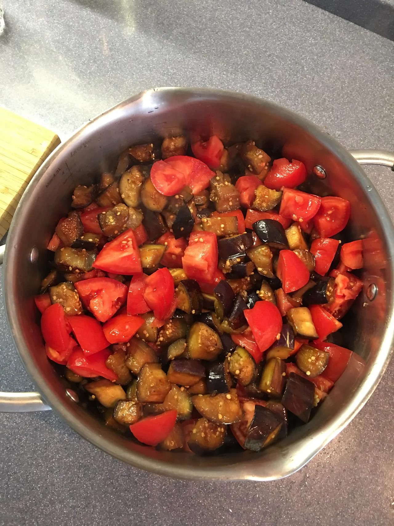 ШАГ 1 Грибы нарезать кубиками со сторонами по 5 мм. Так же нарезать баклажаны, посыпать их солью, дать постоять десять минут и отжать воду. Помидоры избавить от сердцевины, нарезать такими же кубиками.