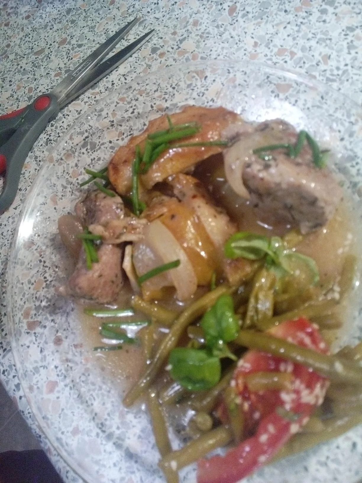 ШАГ 1 Груши разрезать на четыре части, удалив сердцевину, очищенный шалот — на шесть долек. Натереть мясо, груши и лук смесью оливкового масла, измельченных листьев тимьяна и чеснока.