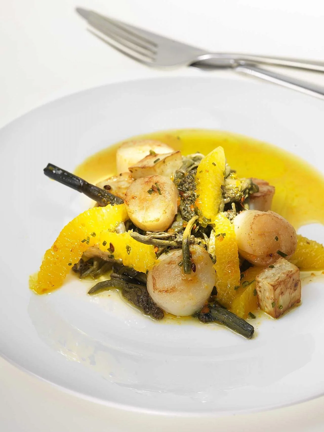 ШАГ 6 В теплый соус добавить оставшееся оливковое масло, дольки апельсина и лук, а следом — сельдерей, гребешки и папоротник. Аккуратно перемешать и разложить по тарелкам.