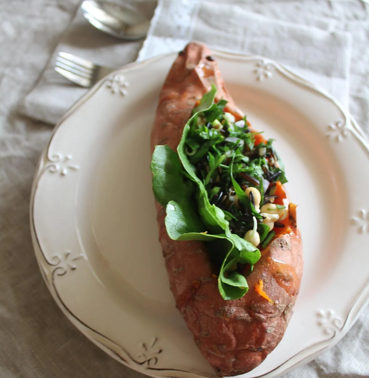 ШАГ 1 Дикий рис промыть и варить в течение часа на среднем огне с добавлением морской соли. Батат тщательно промыть и запекать в духовке в течение 40 минут при температуре 200 градусов. Не очищайте батат от кожуры и не прокалывайте вилкой, так его природный сладковатый карамельный вкус раскроется во всей красе.