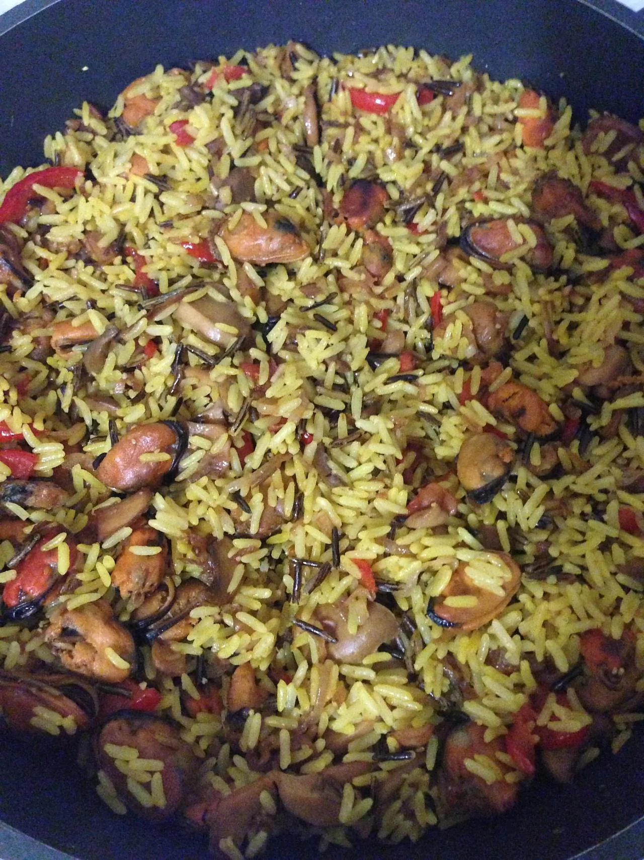 ШАГ 5 Выложить рис на тарелку к мидиям и овощам.