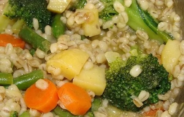 ШАГ 3 Через 1 минуту добавляем перловую крупу (без жидкости для замачивания), кружочками морковь и кубиками картошку. Наливаем воду, закрываем крышкой и варим при медленном кипении 20 минут.