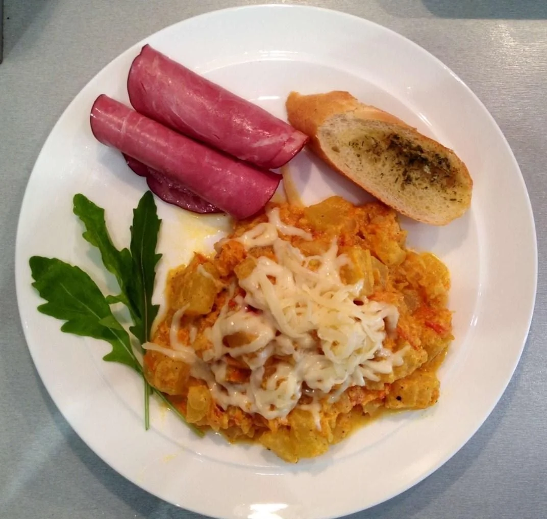 ШАГ 5 Перед подачей кабачки посыпать тертым сыром, украсить зеленью, можно кушать с на резкой говядины и чиабаттой.