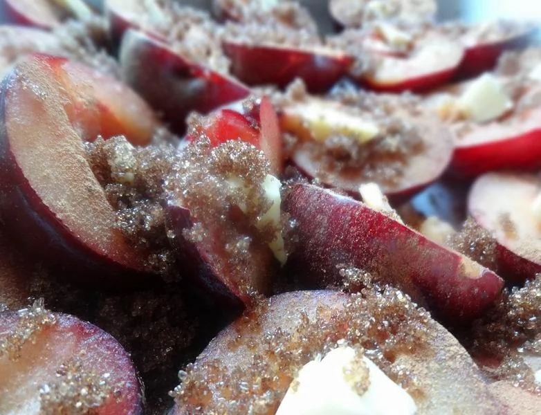 ШАГ 4 Сливы посыпать корицей (мускат, имбирь и перец — по желанию — я добавила имбирь и перец) с коричневым сахаром.
