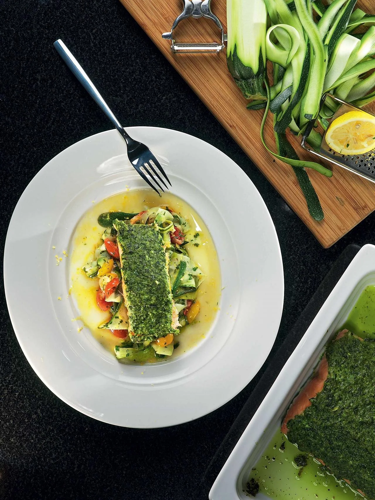 Ингредиенты для приготовления Лосось под корочкой из песто, с лапшой из цукини: