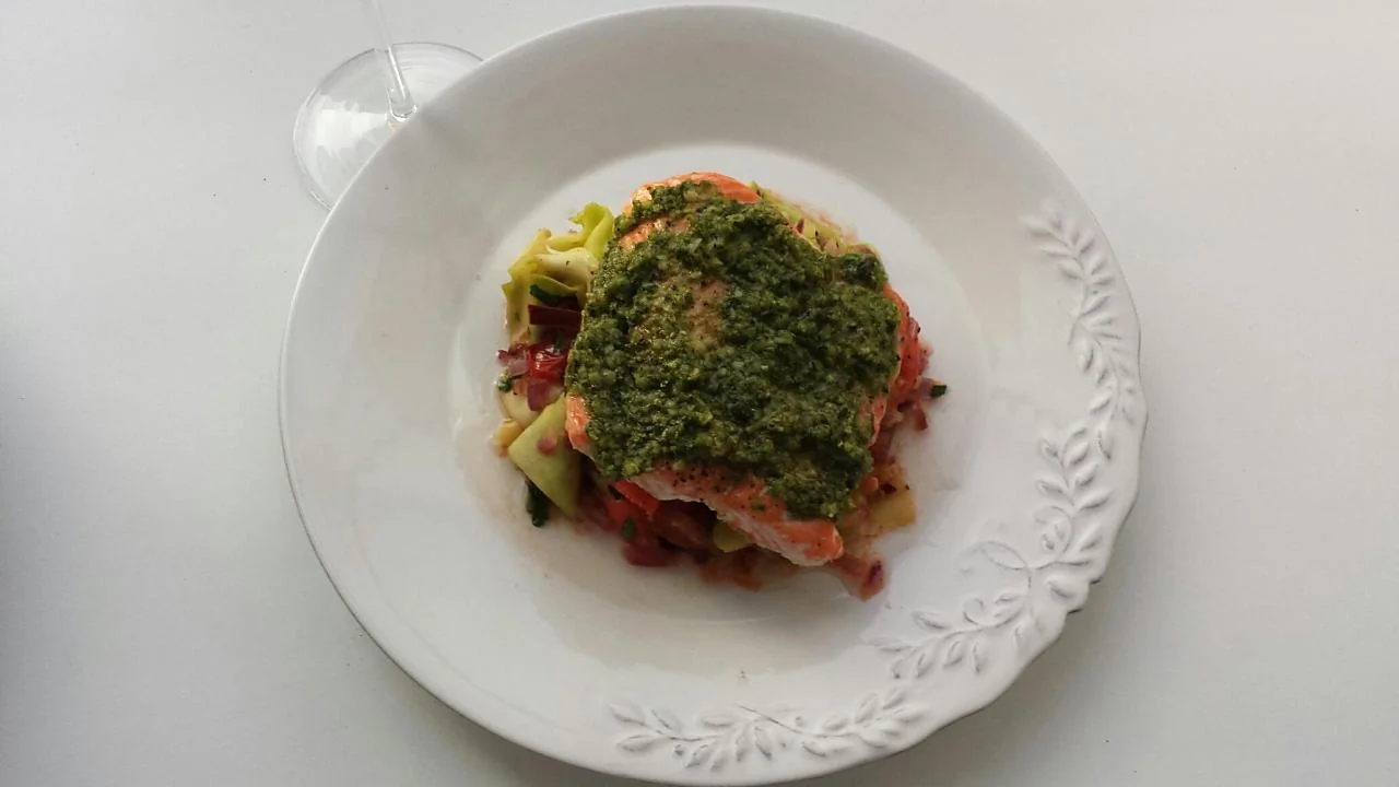 ШАГ 2 Смазать противень сливочным маслом, выложить на него филе лосося без кожи, предварительно посолив его и поперчив. Смазать рыбу пастой песто — тонким слоем, примерно 2–3 мм. Поставить противень в духовку, разогретую до 160 градусов, на семнадцать минут.