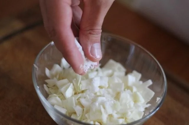 ШАГ 4 Капусту нарезаем небольшими квадратиками. Солим капусту и оставляем на 10–15 минут, чтобы капуста дала сок, затем выкладываем ее на салфетку и полотенце, чтобы капуста получилась максимально сухая.