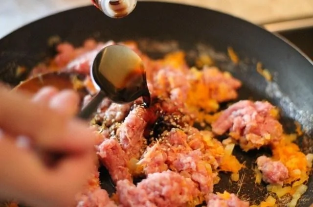 ШАГ 5 Мелко нарезанный лук, морковь, имбирь, обжариваем на подсолнечном масле, затем добавляем свиной фарш, перец и соевый соус.