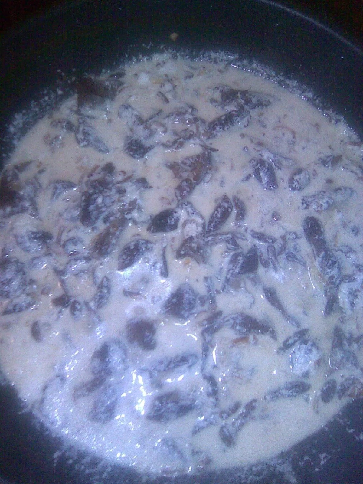 ШАГ 5 Как только наши грибы готовы, добавить к ним сметану, немного разбавив ее водой, чтоб не было сильно густо.