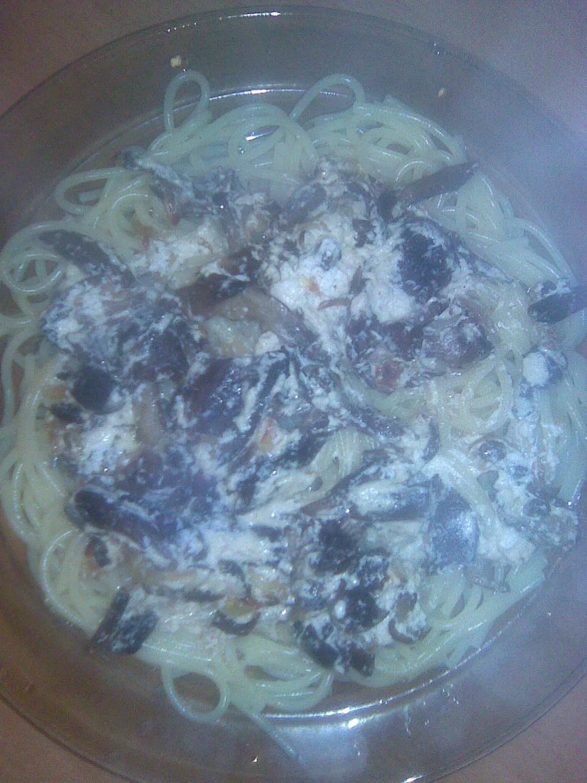 ШАГ 7 Выложить на тарелку спагетти, сверху полить соусом и грибами, при желании можно украсить зеленью.