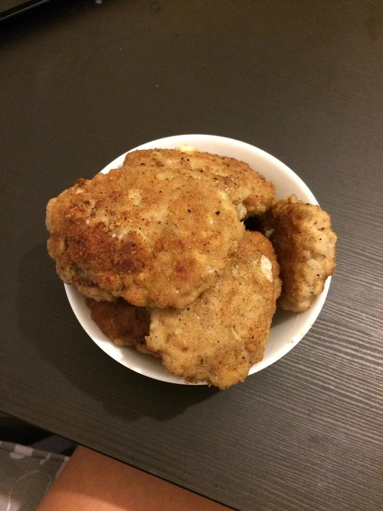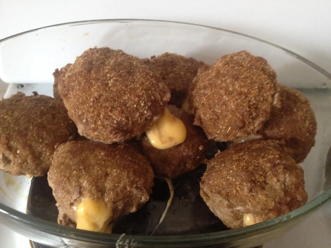 ШАГ 2 Сыр нарезать маленькими кубиками. Из фарша сформировать плоские лепешки. На лепешку положить кубики сыра. Завернуть в виде котлетки и обвалять в панировочных сухарях. На разогретую сковороду налить растительное масло.