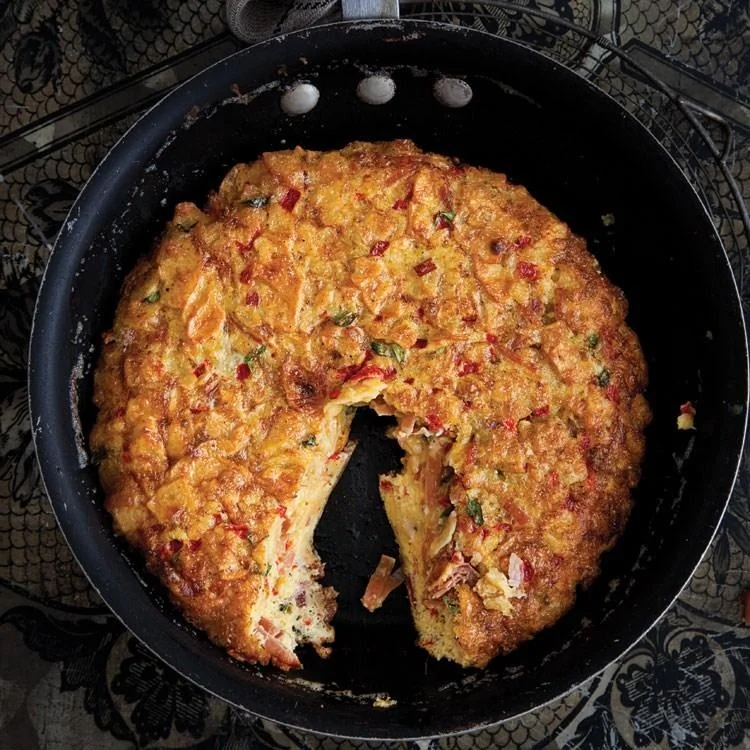 ШАГ 2 В глубокой емкости смешать картофельные чипсы, тонко нарезанную ветчину, мелко нарезанный перец, тимьян. Отдельно немного взбить яйца и влить их к сухой смеси, посолить и поперчить по вкусу. Оставить постоять на 5 минут, чтобы чипсы размягчились.