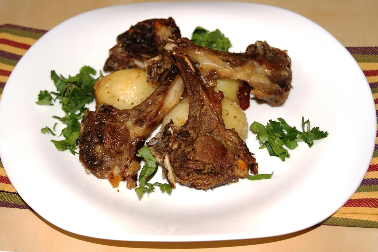 ШАГ 3 Казан хорошо разогреть на сильном огне, разложить по дну мясо, посыпать зирой и солью, сверху положить картофель, посыпать зирой и посолить, накрыть крышкой и оставить на самом маленьком огне на 2 часа.