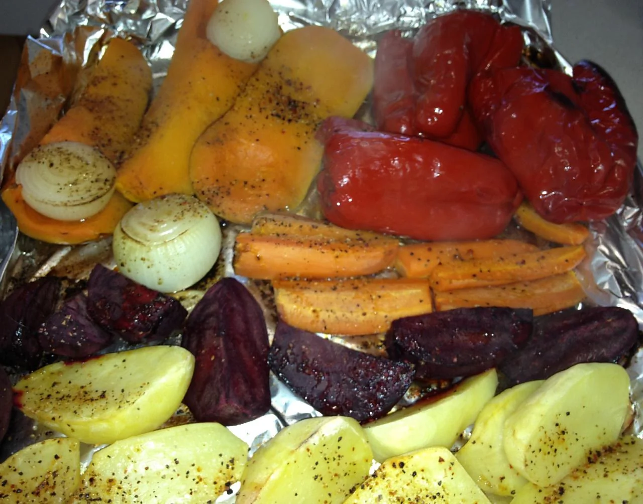 ШАГ 3 На второй противень выложить разрезанную на четвертинки тыкву, свеклу, морковь, красный перец, лук, айву и картофель. Слегка сверху сбрызнуть оливковым маслом, посолить, поперчить. Можно добавить специи на ваш вкус. Овощи сбрызгиваются маслом именно слегка и сверху, в противень с рыбой масло не добавляется,так как в процессе запекания выделится жир.