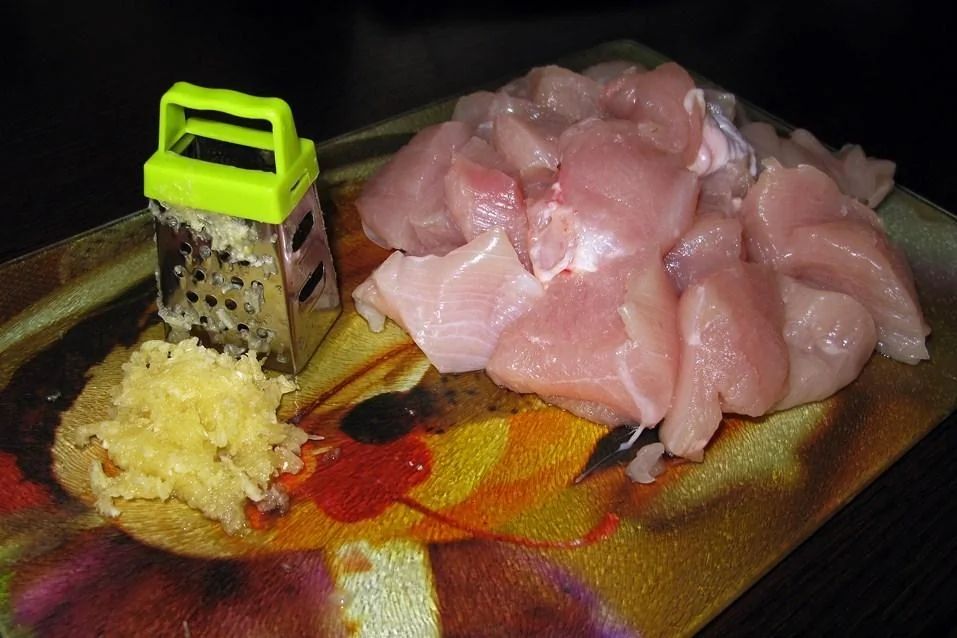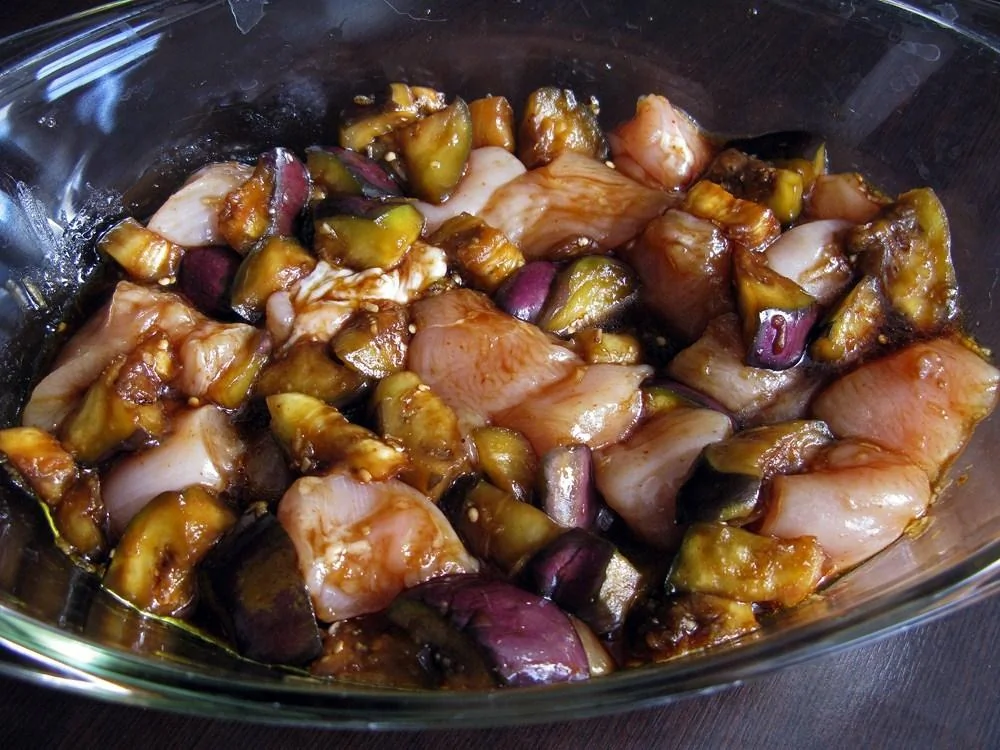 ШАГ 1 Баклажаны и куриную грудку (можно и другие части) нарежьте кусочками. Баклажаны посолите в отельной миске, перемешайте и дайте полежать, пока готовите маринад, чтобы вышла горечь.