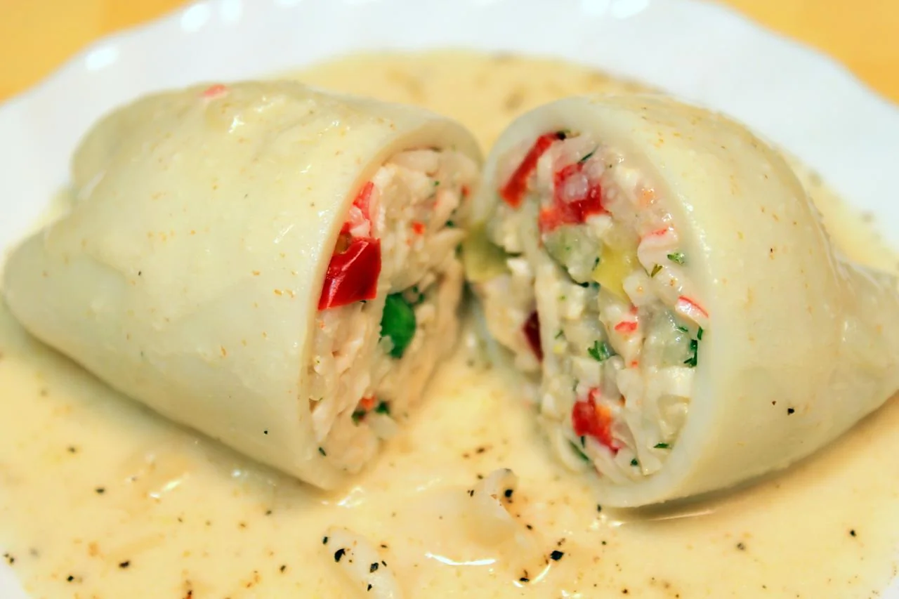 Ингредиенты для приготовления Кальмары, фаршированные овощами с крабовыми палочками: