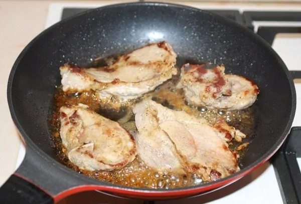 ШАГ 3 В сковороде разогреть растительное мало и выложить куски свинины на нее. Обжарить по 3–4 минуты на каждой стороне на сильном огне до образование золотистой корочки. Рекомендую наполовину прикрыть сковороду крышкой, если не хотите забрызгать маслом все вокруг.