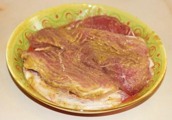 ШАГ 2 Выложить мясо в тарелку, добавить горчицу и как следует все перемешать. Оставить мясо мариноваться при комнатной температуре примерно на 40 минут –1 час.