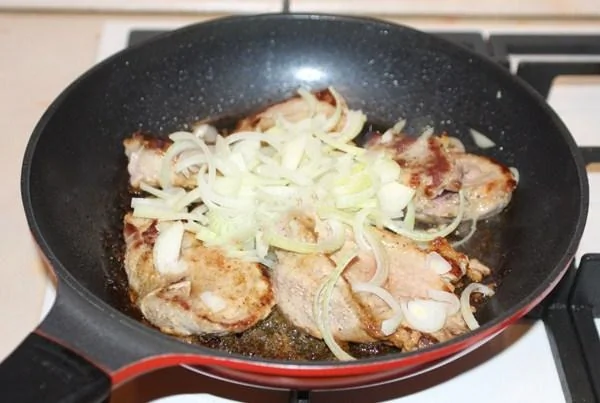 ШАГ 4 Когда мясо обжарено, добавить нарезанный полукольцами репчатый лук, убавить огонь до среднего и накрыть крышкой. Слегка потушить, примерно 5 минут.