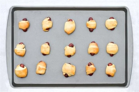 ШАГ 2 Каждую сосиску смазать взбитым яйцом. Запекать в духовке 20 минут при температуре 200 градусов. Перед подачей на стол необходимо вытащить зубочистки. Подавать с любыми овощами.