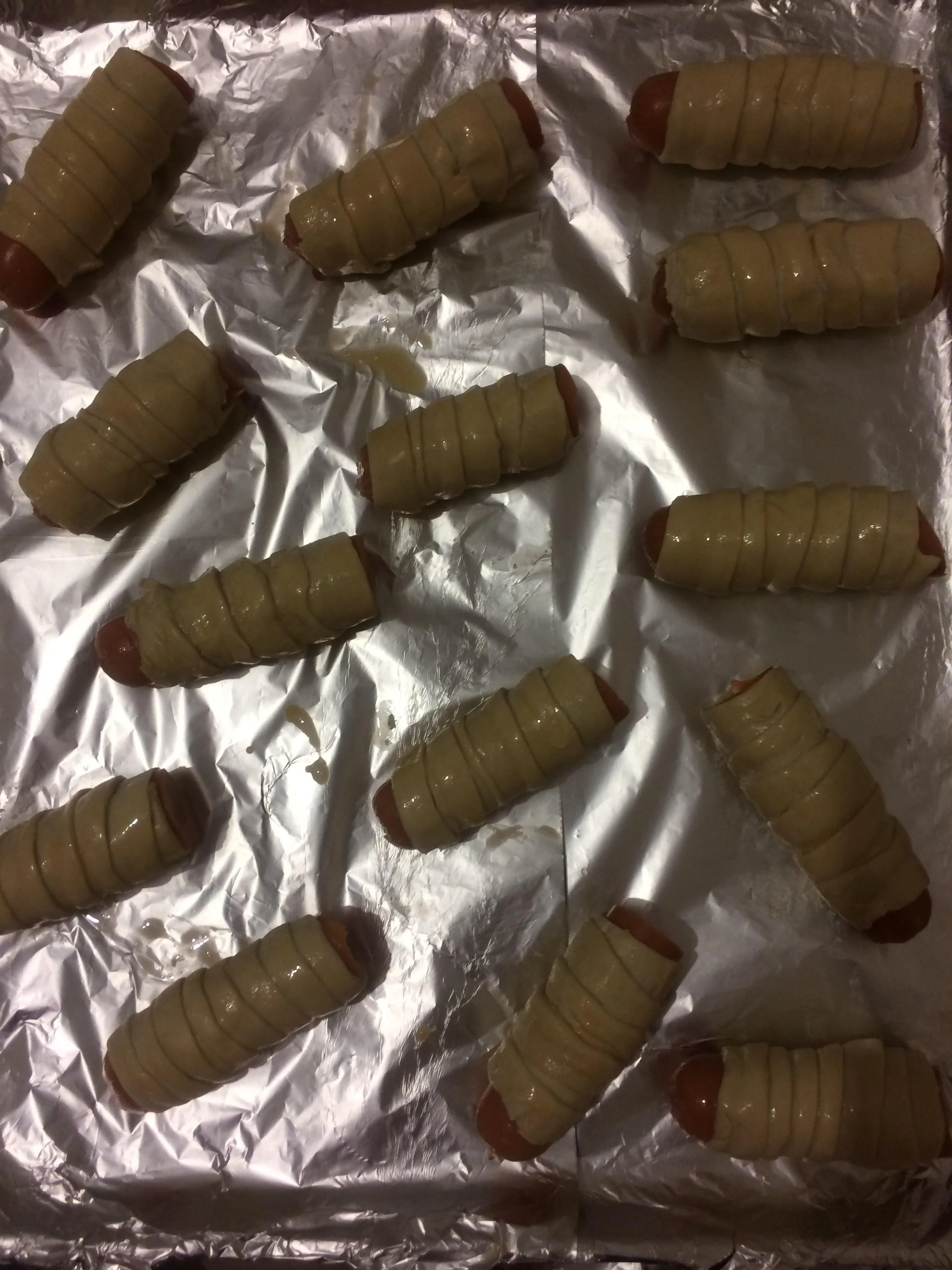 ШАГ 1 Готовое слоеное тесто раскатать. Разрезать на 8 полосок размером 30х2 см. Смазать тесто томатным кетчупом и обернуть полосками теста отваренные охлажденные сосиски (концы полосок закрепить половинками зубочисток).