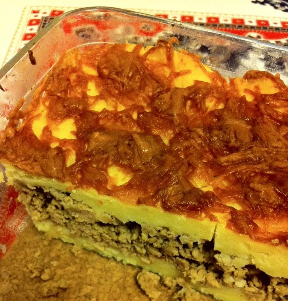 ШАГ 5 Смазать форму для запекания маслом. Выложить слоями половину пюре, затем фарш, пюре, сверху посыпать оставшимся пармезаном. Поставить в духовку, разогретую до 180 градусов, на полчаса.