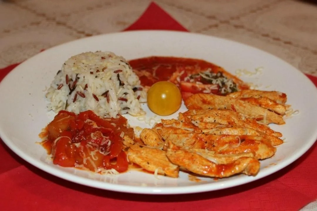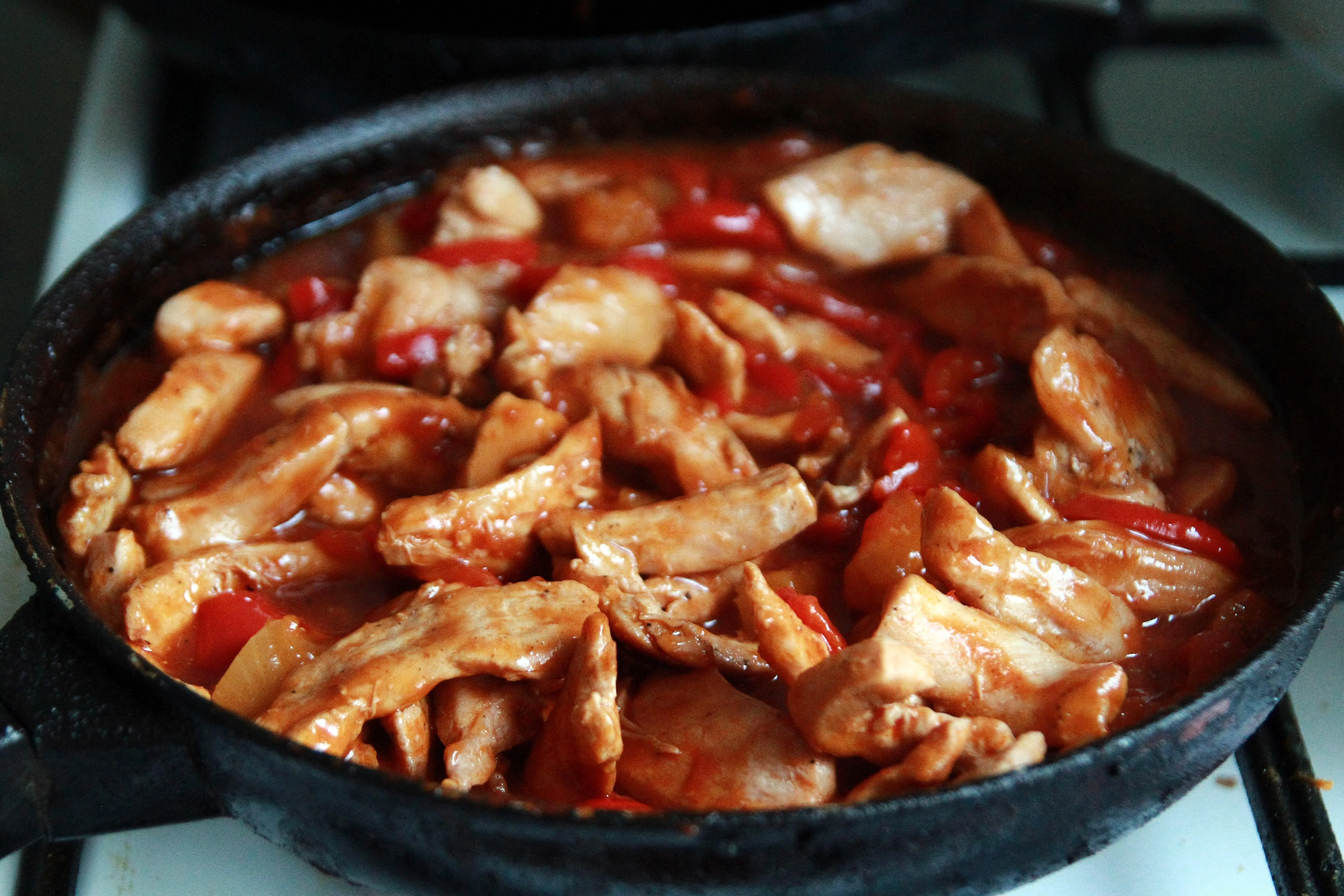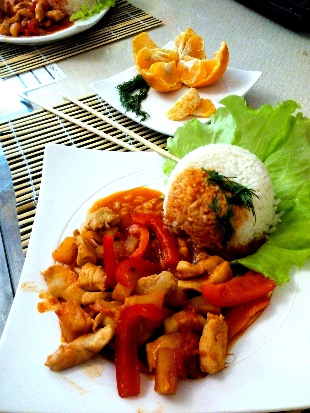 ШАГ 3 Обжарить курицу, соединить с соусом и потушить еще минут 10. Подавать с рисом.