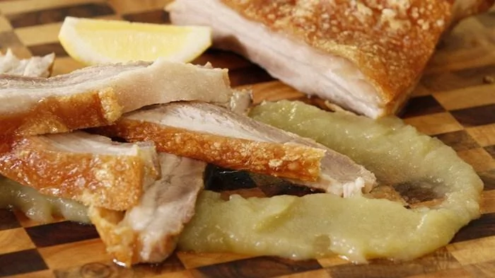 ШАГ 6 Достать грудинку из духовки и дать отдохнуть минут 10–15. Затем нарезать на ломтики и подавать с яблочным соусом.