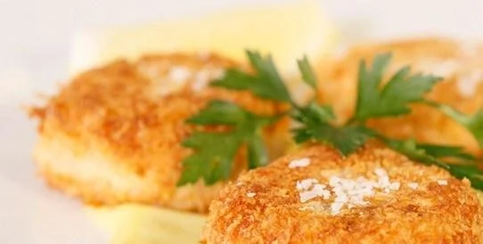 ШАГ 2 Выложить консервированный тунец в большую миску и смешать его с картофельным пюре. Добавить горчицу, измельченный лук-шалот, кайенский перец, лимонный сок и цедру 0,5 лимона, измельченные каперсы, измельченную петрушку и яйца. Приправить по вкусу. Деревянной ложкой хорошо перемешать ингредиенты. Если смесь кажется немного жидкой, добавить немного панировочных сухарей.