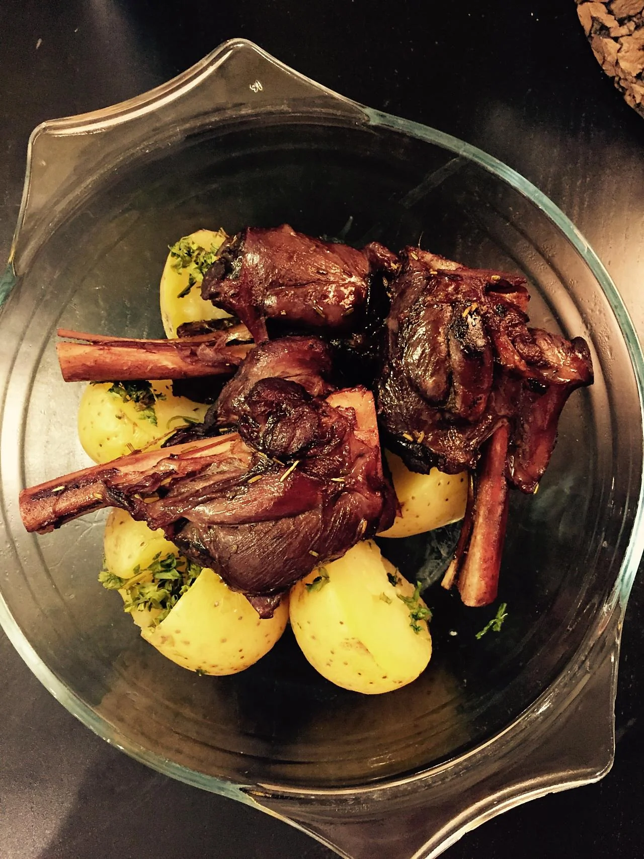 ШАГ 2 Выложить все в кастрюлю, перемешать. Залить вином так, чтобы оно покрывало мясо не полностью, и поставить на сильный огонь. Когда закипит, огонь уменьшить до слабого. Перемешать еще раз и оставить на огне на час, каждые пятнадцать минут перемешивая снова.