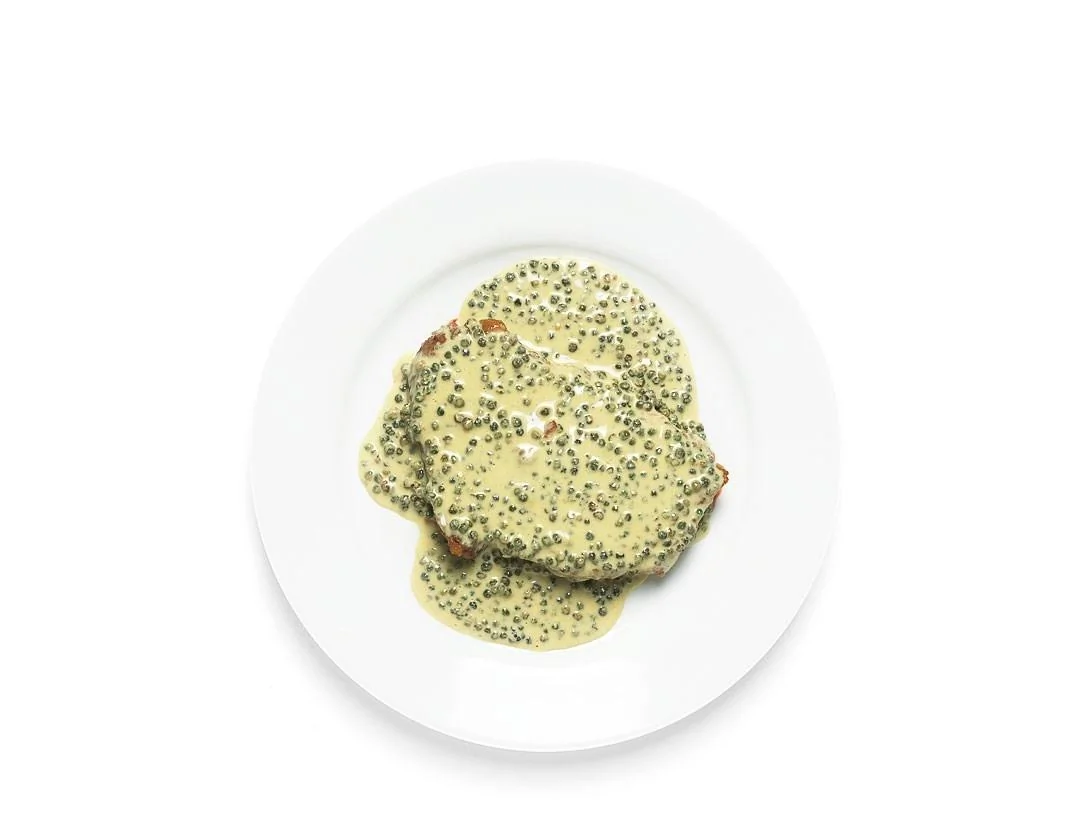 ШАГ 1 Налить в сотейник говяжий бульон, насыпать горошины сухого зеленого перца и поставить на средний огонь. Варить десять-пятнадцать минут, добавить сливки и готовить, пока соус не загустеет. Посолить, вмешать ложку горчицы и снять с огня.