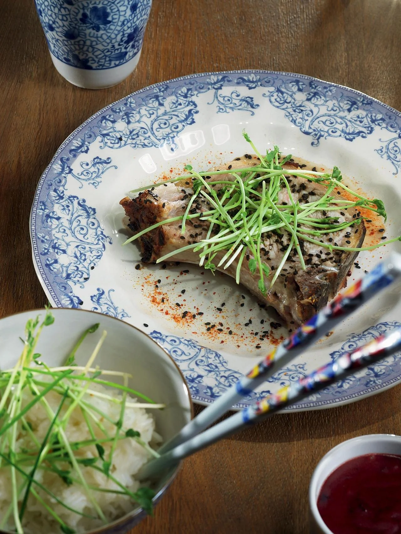 ШАГ 4 Подавать обжаренную капусту и рис к запеченным отбивным, посыпав их овощными проростками, крупно молотым черным перцем и острой паприкой.