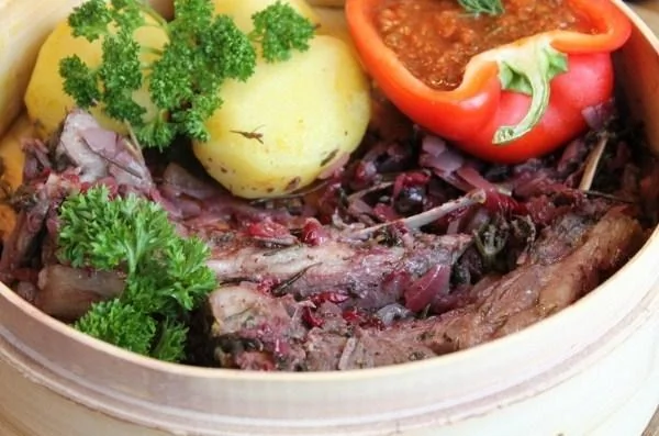 ШАГ 5 За 25–30 минут до окончания приготовления баранины в пароварку рядышком укладываем картофель. Для украшения — перед подачей берем болгарский перец и разрезаем его пополам. В него наливаем самодельную аджику. Снимаем с огня, сервируем и подаем!