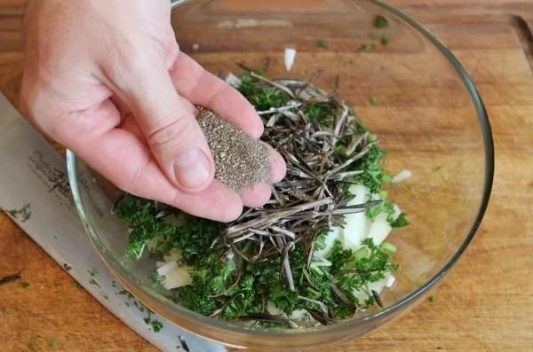 ШАГ 1 Репчатый лук режем кубиком среднего размера. Укроп, петрушку и розмарин шинкуем не слишком мелко. Добавляем черный молотый перец, соль, зиру, мелко натертый чеснок, бруснику. Переминаем все руками, чтобы брусника вся полопалась.