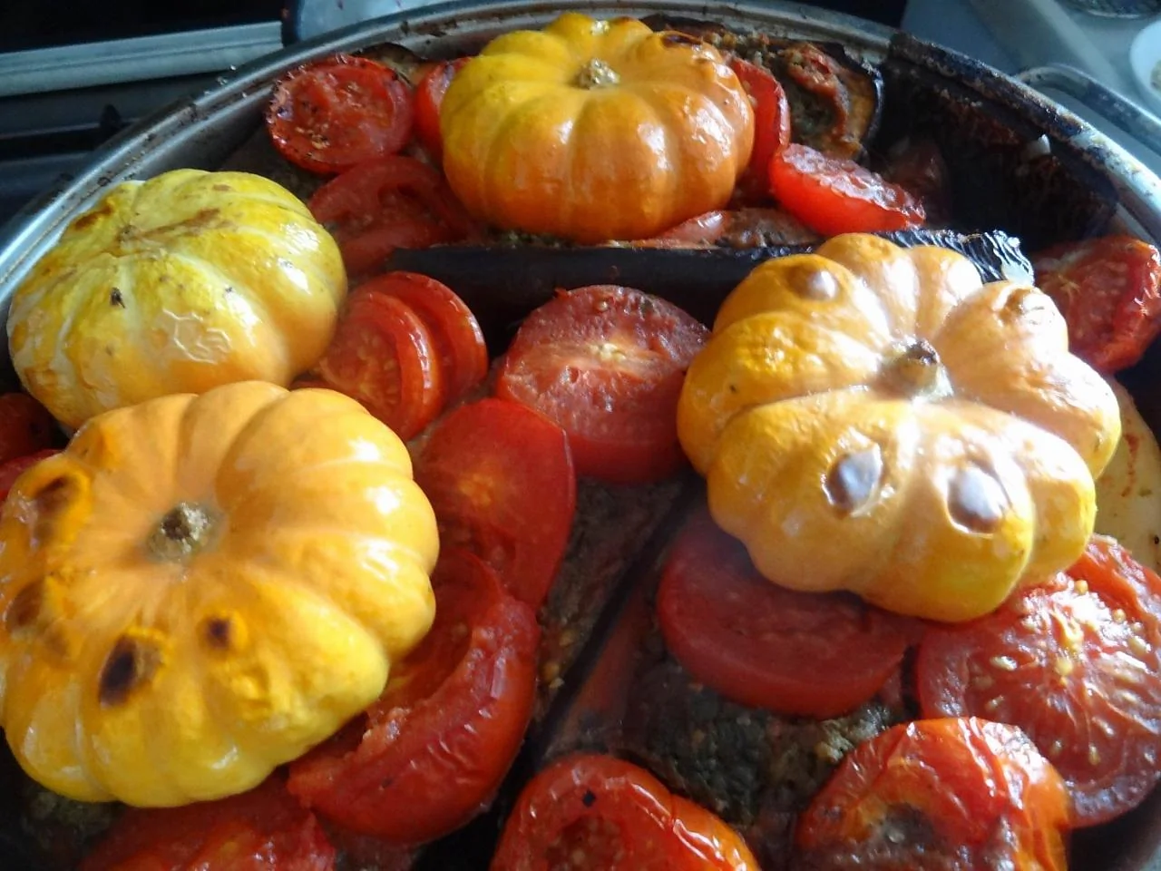 ШАГ 8 На картофель — сливы, баклажаны, фаршированные зеленью, чесноком, орехами, топленым маслом, посолить и поперчить. Затем выложить помидоры, посолить и поперчить. Тыкву и залить томатным соком.