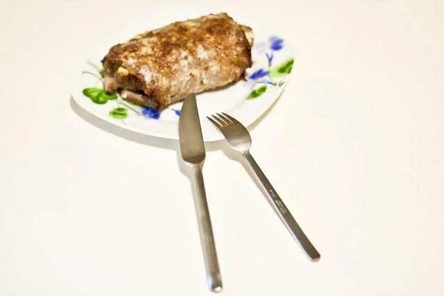 ШАГ 2 Перемешиваем начинку с добавлением соли и перца, выкладываем на мясо и аккуратно заворачиваем в рулет.