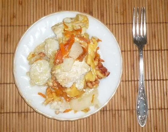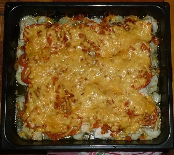 ШАГ 1 Помытый и очищенный картофель нарежьте кружками уложите на дно формы для запекания или противня. Филе рыбы порежьте по своему вкусу, но не очень мелко, и выложите поверх картофеля.