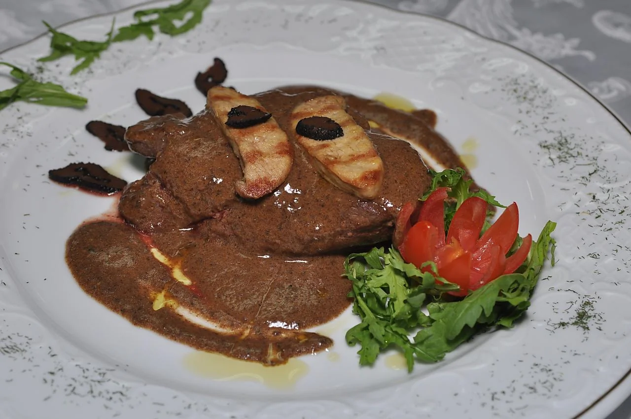ШАГ 5 На блюдо выложить стейк, полить сверху соусом, сверху выложить кусочки фуа-гра. На фуа-гра выложить кусочки трюфеля.