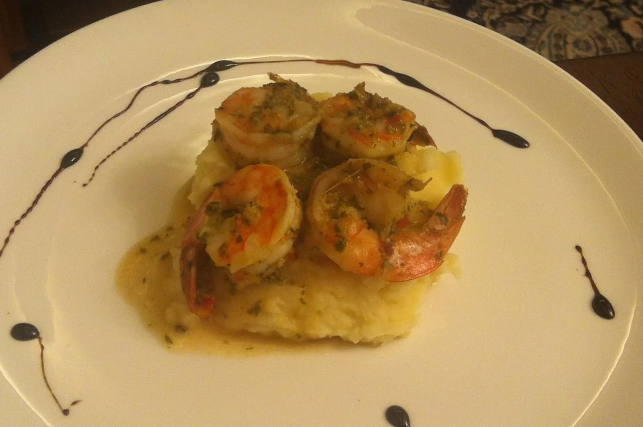 ШАГ 6 Выложить на тарелку пюре, на него — креветки. Сверху полить образовавшимся при приготовлении креветок в пароварке соком.