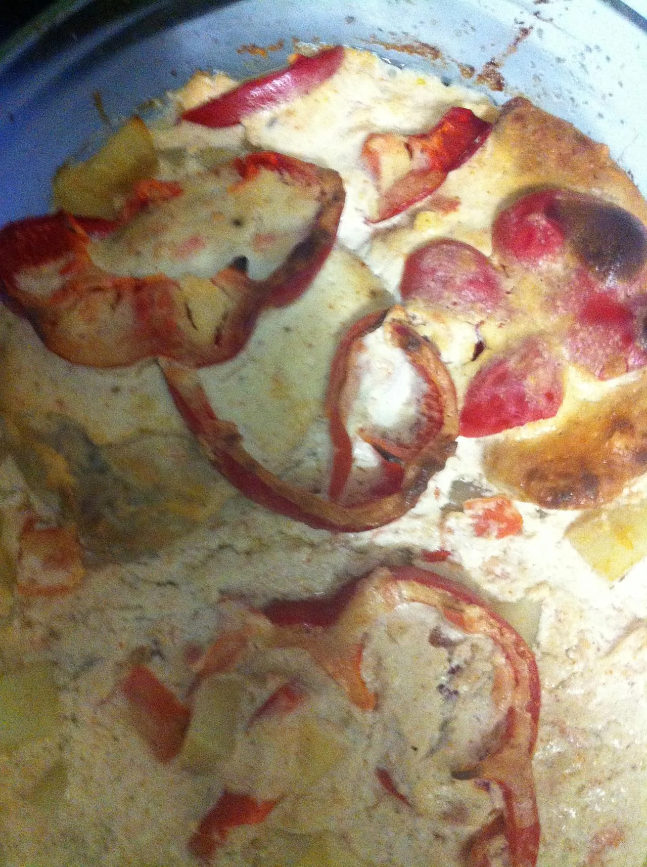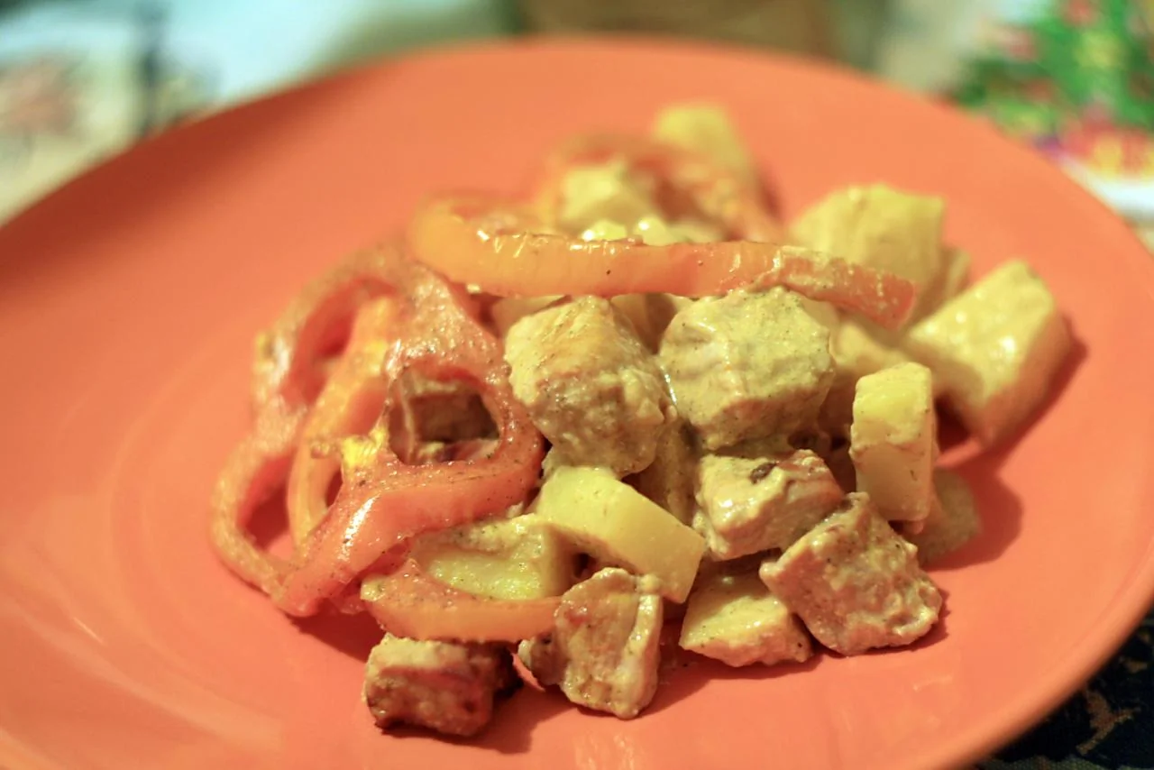 ШАГ 4 В сметану добавить чеснок, половину чайной ложки хмели-сунели, немного перца чили и томатный сок, перемешать и вылить на перец. Нужно, чтобы соус скрывал мясо.
