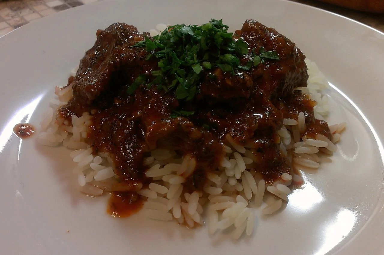 ШАГ 4 Когда соус начнет кипеть выложить в него мясо, перемешать, что бы соус покрыл его. Убавить огонь на самый минимум , накрыть крышкой, готовить 30–40 минут. За это время хорошо бы раза два аккуратно перемешать содержимое.