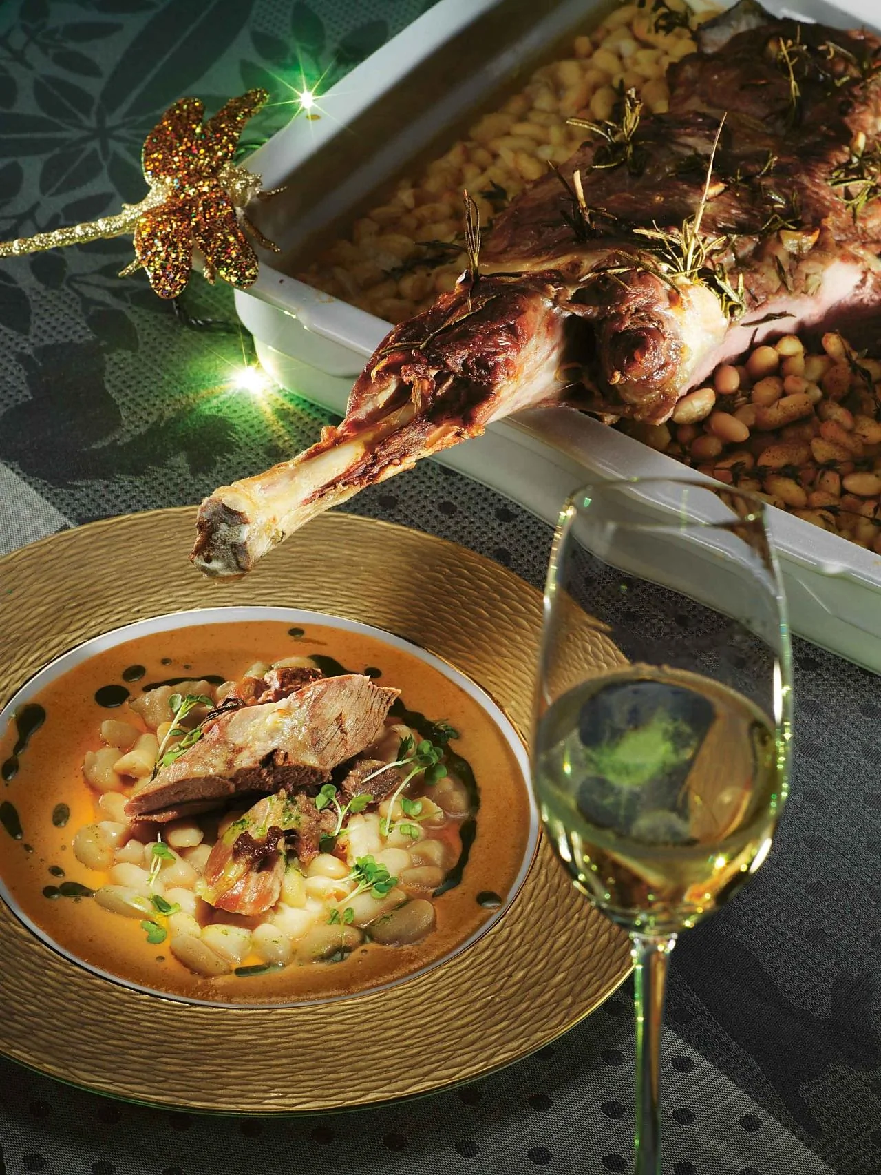 Баранина с розмарином, чесноком, печеной фасолью и перечным соусом