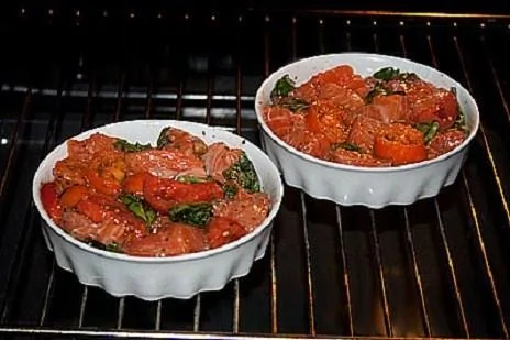 ШАГ 9 Выложить рыбу с томатами и базиликом в огнеупорные формы.