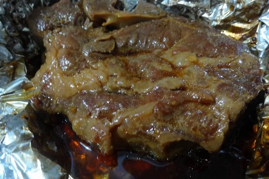 ШАГ 3 Каждый стейк вместе с маринадом завернуть в фольгу конвертом. Предварительно поперчить.