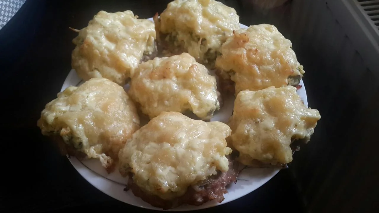 ШАГ 2 Сделать из фарша небольшие круглые лепешки (диаметр 10 см). Выложить на противень, смазанный растительным маслом. Сверху выложить слой обжаренного лука с грибами. Затем слой яиц с майонезом. На яичный слой положить натертый картофель в виде стожка. Сверху посыпать сыром и сделать паутинку (сеточку) из майонеза.