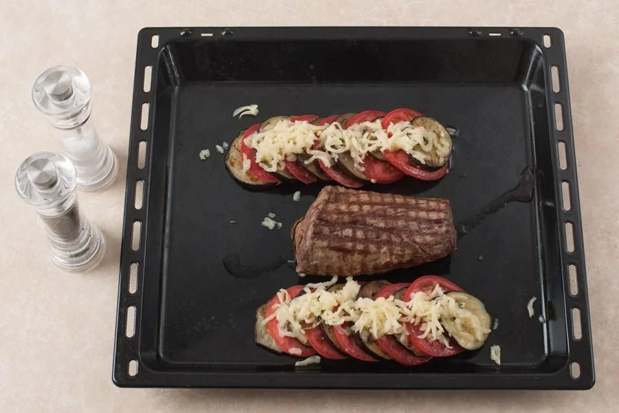 ШАГ 4 Выложите баклажаны и помидоры на противень к мясу поочередно внахлест, посыпьте мелконарубленным чесноком и розмарином, посолите, поперчите, посыпьте тертой моцареллой и запекайте с говядиной при 180 градусах в течение 7 минут.