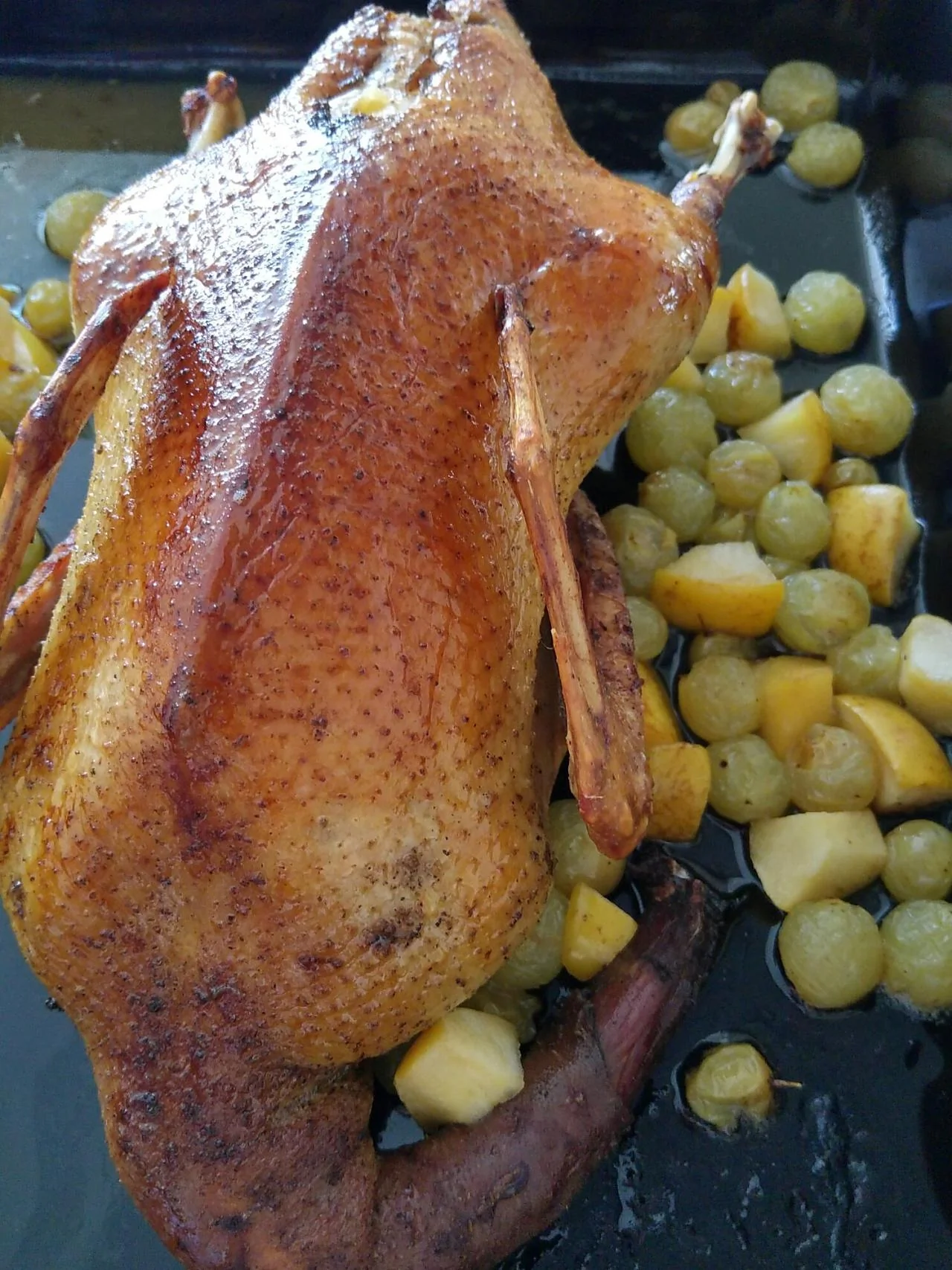 ШАГ 5 Утку вновь достать, аккуратно переложить к ней тушенные яблоки и виноград и вылить получившийся соус. Убрать в духовку еще на 15 минут.