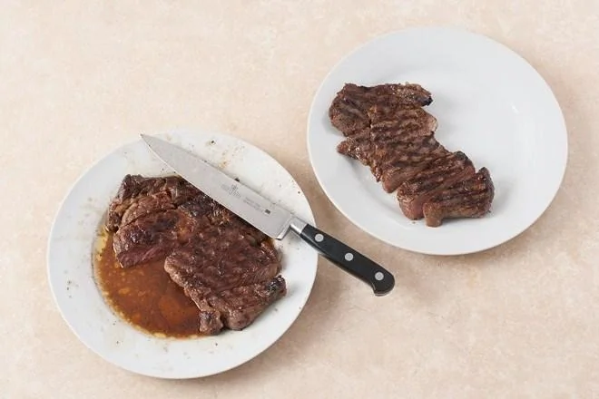 ШАГ 6 Снимите мясо со сковороды, полейте небольшим количеством оливкового масла и дайте ему отдохнуть 3–4 минуты; разрежьте стейк на кусочки толщиной 2 см и переложите в тарелки; полейте кусочки стейка выделившимся соком.