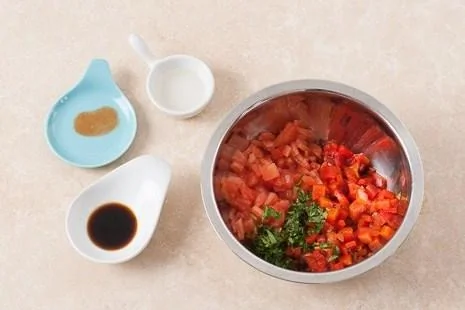 ШАГ 2 Нарежьте перец и помидор кубиком 0,5х0,5 см, мелко нарубите кинзу, добавьте уксус, ворчестер и табаско, перемешайте; гарнир готов.