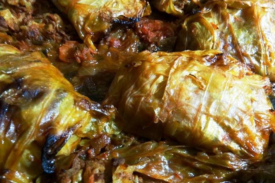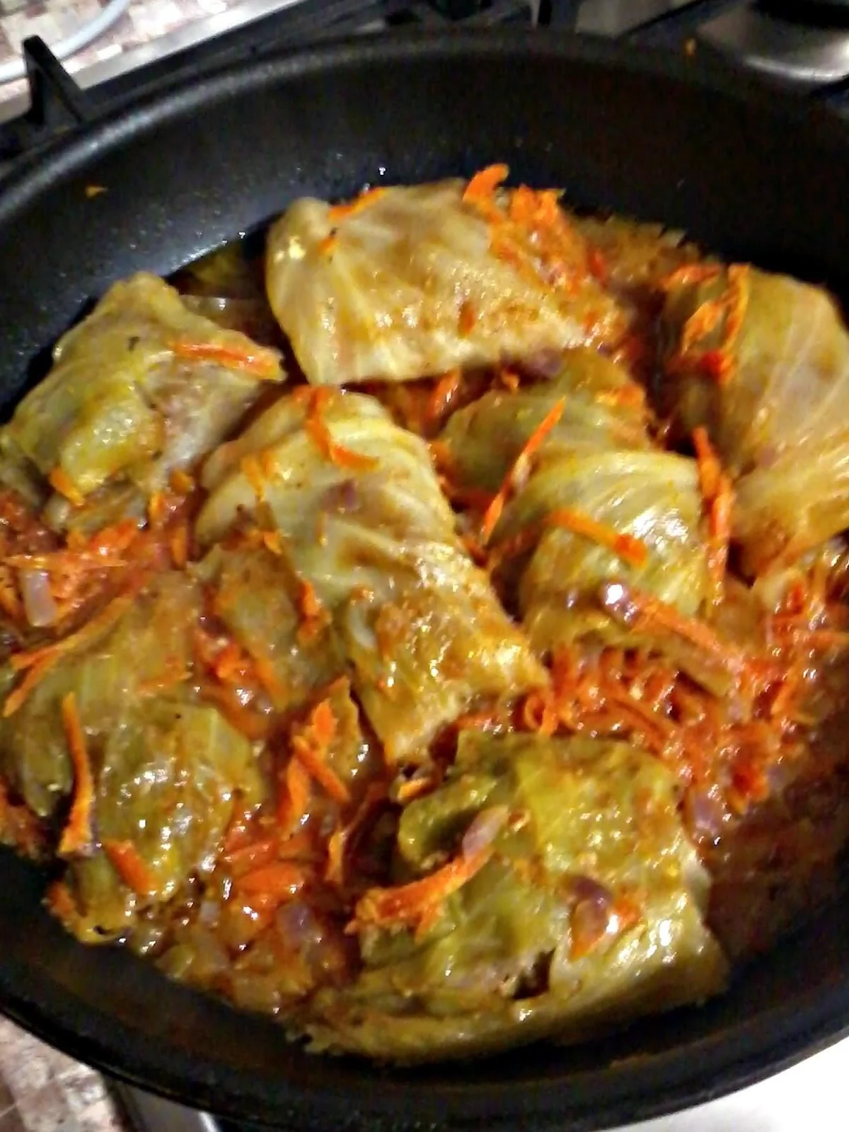 ШАГ 5 Положить голубцы в зажарку. Каждый слой прокладывать стеблями сельдерея и оставшейся капустой. Пока процесс идет на газу.